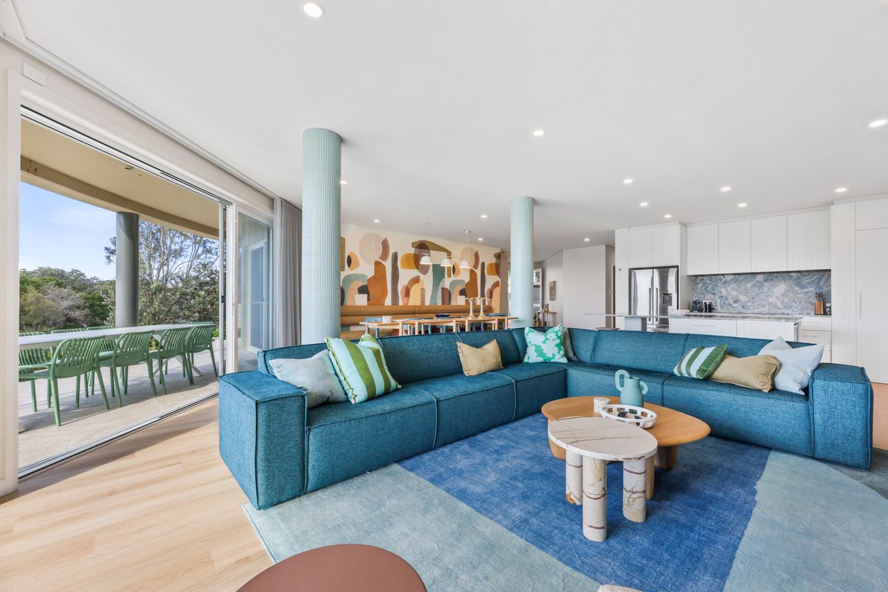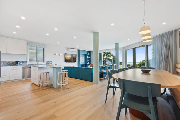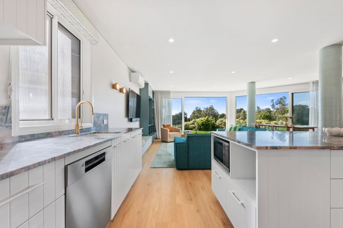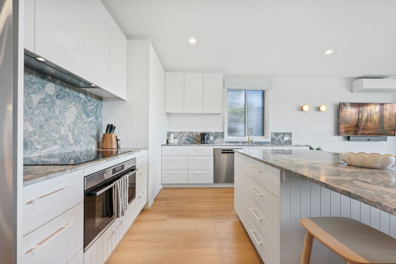 The fully equipped kitchen flows into an open-plan dining and living space, filled with natural light and designed for easy holiday living. Large windows bring the outdoors in, showcasing the natural beauty of South West Rocks throughout the home.